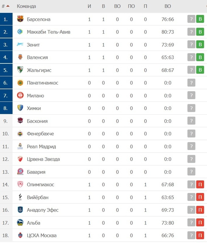 Стартував новий сезон баскетбольної Євроліги. У першому турі перемоги здобули «Анадолу Ефес», «Жальгіріс», «Маккабі», «Валенсія» і «Барселона».