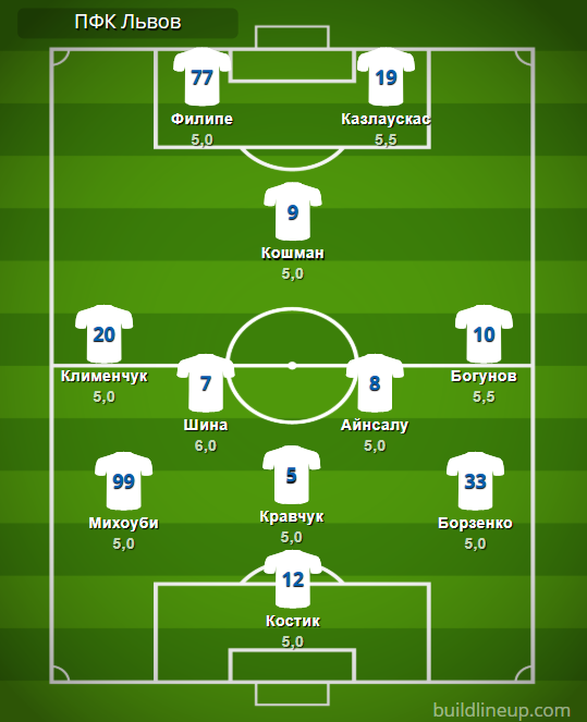 ПФК «Львів»: Костик – Міхоубі, Кравчук, Борзенко – Клименчук, Шина (Сабіно, 63), Айнсалу, Богунов – Кошман – Філіпе (Нич, 54), Казлаускас (Чир’як, 74).