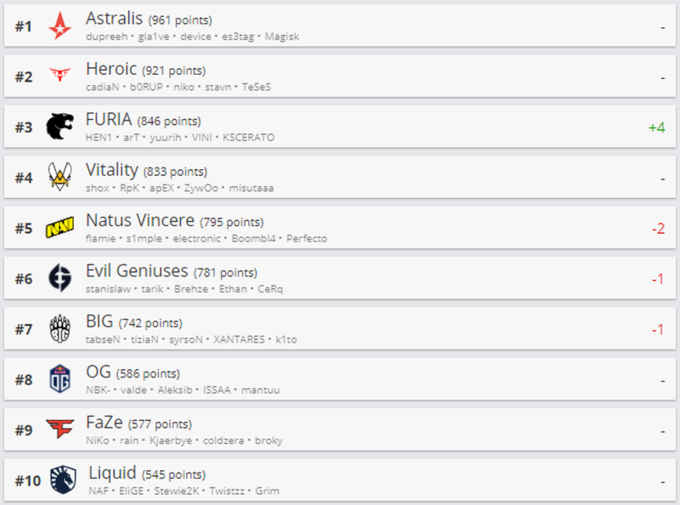 Лідерами списку залишилися Astralis і Heroic. Fnatic обійшла Complexity Gaming і зайняла 12-те місце, а 100 Thieves опустилися на 16-те, пропустивши вперед mousesports і Ninjas in Pyjamas.