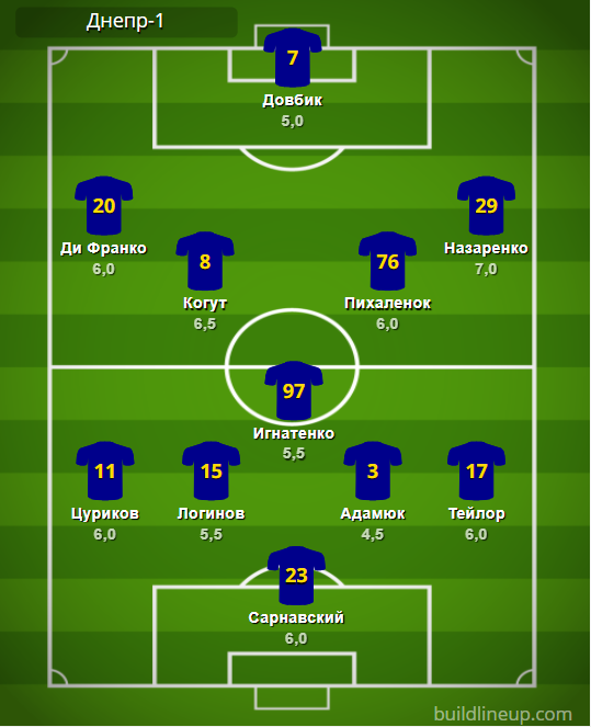 «Дніпро-1»: Сарнавський – Цуріков, Логінов, Ігнатенко (Кравченко, 73), Адамюк – Піхальонок, Ді Франко (Чічіков, 63) – Назаренко (Коркішко, 80), Когут (Батагов, 63), Тейлор – Довбик (Хобленко, 63).