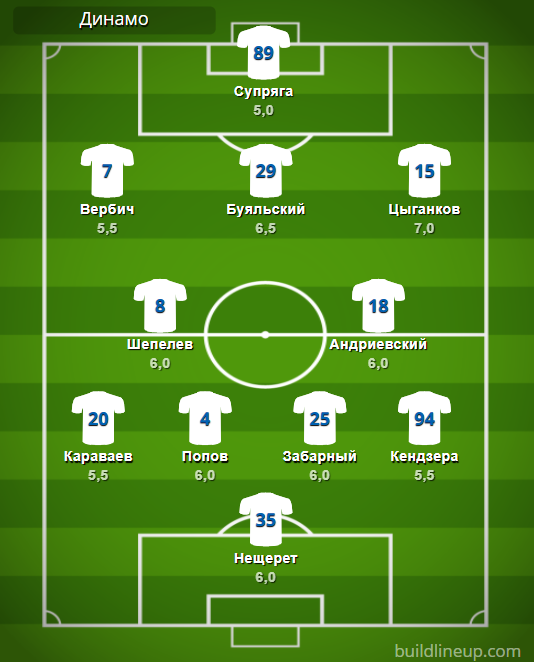 «Динамо»: Нещерет – Караваєв, Попов, Забарний, Кендзьора – Шепелєв (Сидорчук, 85), Андрієвський – Вербич (Родрігес, 64), Буяльський (Лєднев, 73), Циганков – Супряга.