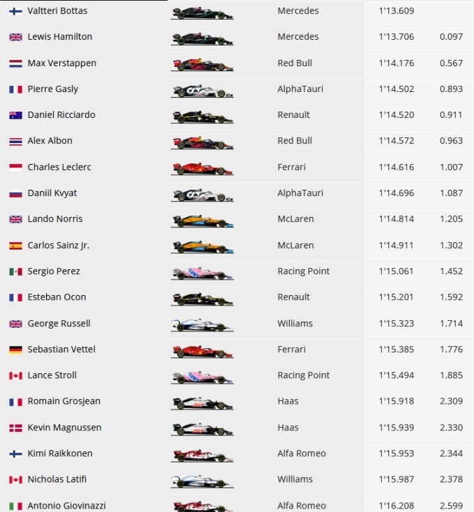 Топ-10: Боттас, Хемілтон, Ферстаппен, Гаслі, Ріккардо, Альбон, Леклер, Квят, Норріс, Сайнс