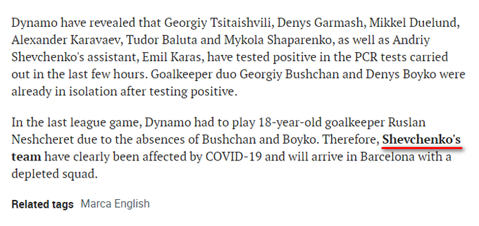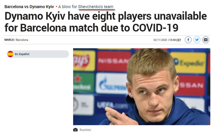 У статті-прев'ю матчу Ліги чемпіонів між «Барселоною» і «Динамо» журналісти Marca розповіли про зараження гостей коронавірусом та несподівано написали, що київську команду тренує Андрій Шевченко (який насправді очолює національну збірну України).