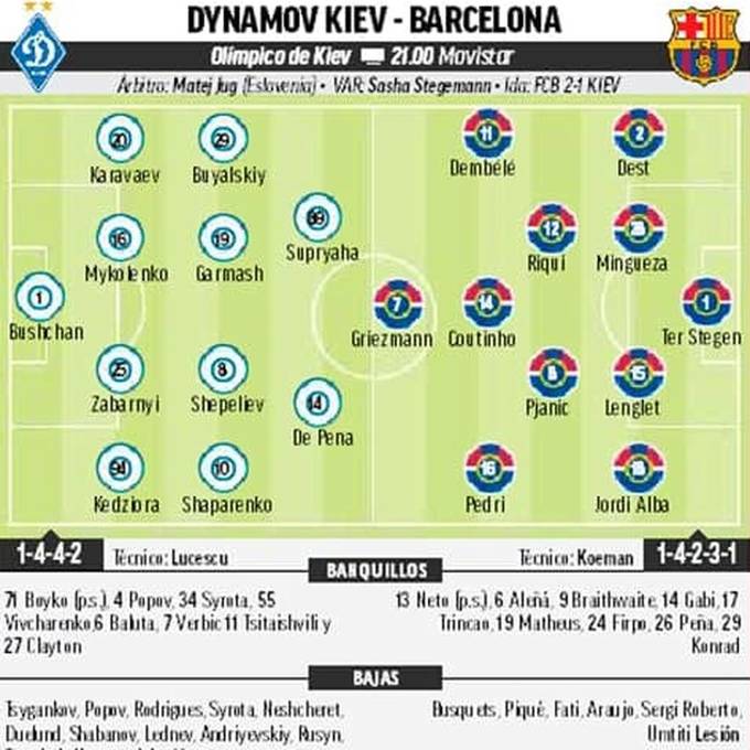 Авторитетне іспанське видання Marca опублікувало орієнтовні склади команд перед матчем четвертого туру групового раунду Ліги чемпіонів, в якому «Динамо» прийме «Барселону».