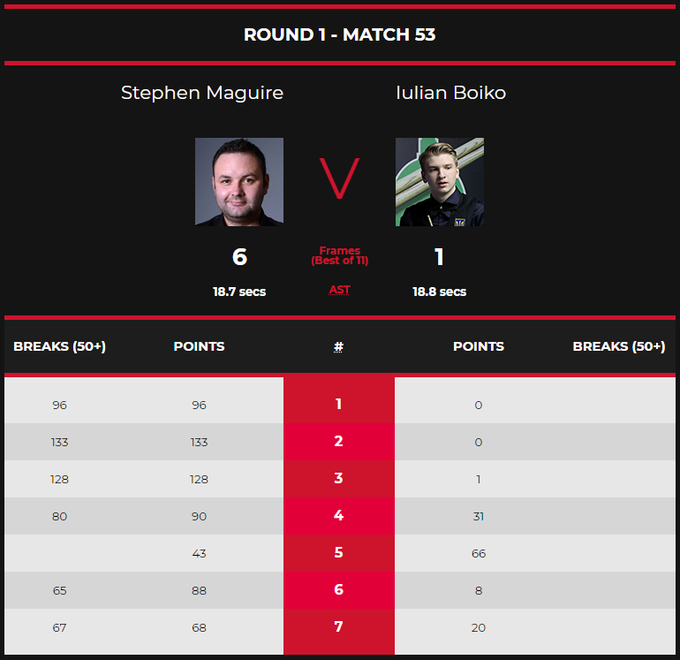 Шотландець за гру зробив 2 брейка за 100 очок і ще 4 серії за 50. Бойко зумів взяти лише один фрейм за рахунку 0:4.