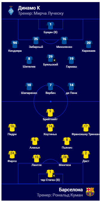 «Барселона»: тер Штеген, Фірпо, Лангле, Мінгеса, Дест, Аленья, Пьянич, Педрі, Трінкау, Коутіньо, Брейтвейт.