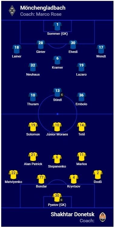 «Боруссія» Менхенгладбах: Зоммер - Лайнер, Гінтер, Ельведі, Вендт - Крамер, Нойхаус, Лацаро, Штіндль - Емболо, Тюрам