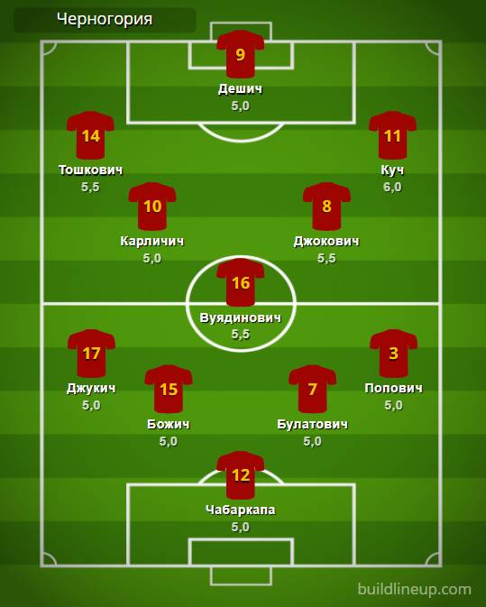 Чорногорія: Чабаркапа – Джукіч, Божич, Булатовіч, Попович – Карлічич, Вуядіновіч (Мараш, 56), Джокович (Радунович, 89) – Тошкович, Дешич, Куч (Бечич, 80).