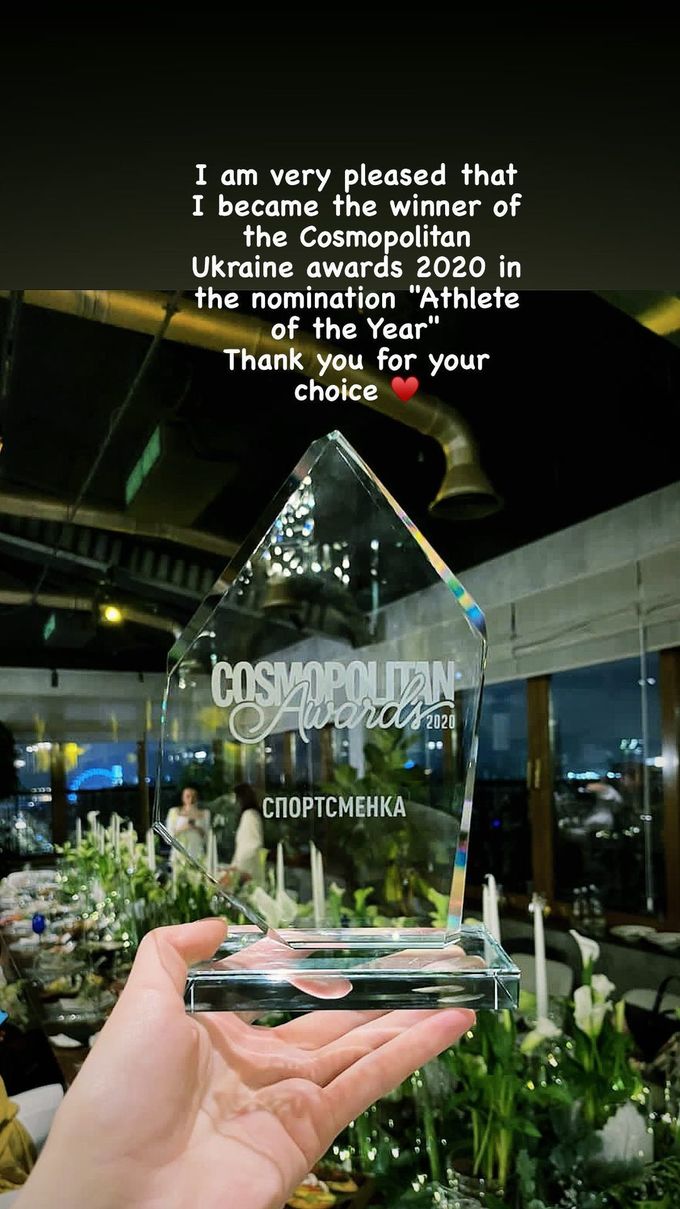 «Мені дуже приємно, що я стала переможницею Cosmopolitan Ukraine Awards 2020 на номінації «Спортсмен року». Дякую за ваш вибір», - написала Еліна в інстаграмі.