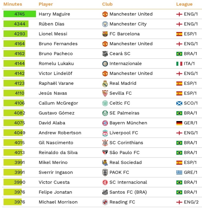 26-річний поляк в сумі зіграв 3726 хвилин за клуб і збірну Польщі. Це 66-е місце в рейтингу, яке він ділить з хавбеком «Ман Сіті» Родрі.