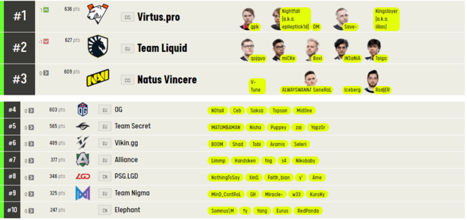 Новим лідером стала Virtus.pro, яка змістила з першого місця Liquid. Український склад Natus Vincere утримує третє місце.