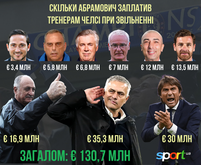 Хоча жорстке і колюче слово «компенсація» ніколи не лякало норовливого власника «аристократів». Допитливі англійські ЗМІ підрахували, що за 17 років перебування на чолі «Челсі» його російський власник виплатив тренерам в якості «відступного» понад сімдесят мільйонів фунтів. Один тільки тренерський штаб Моурінью за два приходи отримав за достроковий розрив контрактів трохи більше 35 мільйонів євро. Грунтовно «нагрів» Абрамовича «за шкідливість» і не досидів до кінця угоди Конте: 30 мільйонів євро. Віллаш-Боаш (16,9) і Сколарі (13,5) зі своїми мільйонами виглядають на тлі дорогих колег, як бідні родичі.