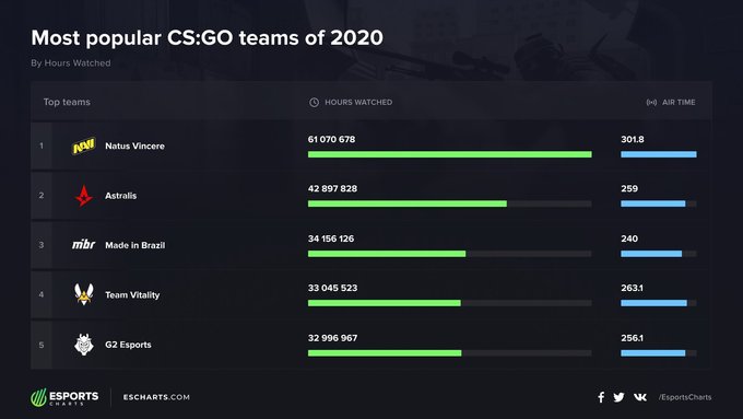 Склад з CS:GO української організації Natus Vincere став найпопулярнішим в 2020-му році. Трансляції NAVI зібрали найбільшу кількість переглядів. Сумарно NAVI зібрали 62 мільйонів годин перегляду. Слідом ідуть Astralis - за іграми данців спостерігали 43 мільйонів годин. Трійку замкнув бразильський тег MIBR (34 мільйонів годин).