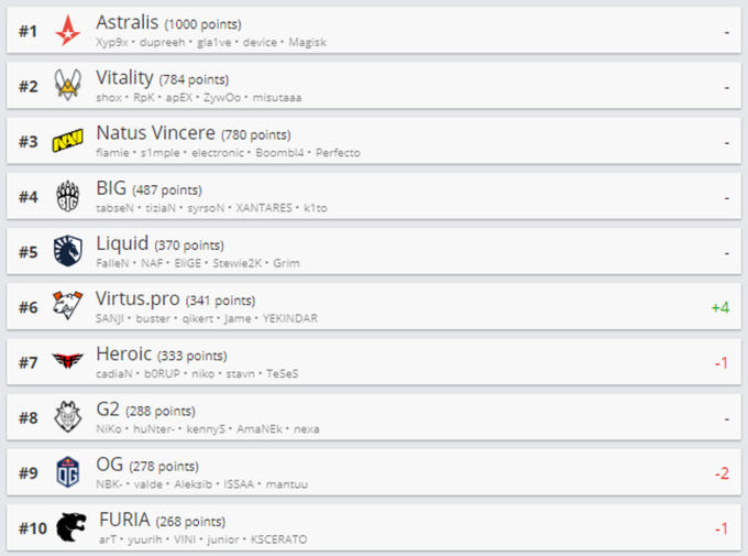 Лідерами рейтингу залишилися Astralis, Team Vitality і Natus Vincere.