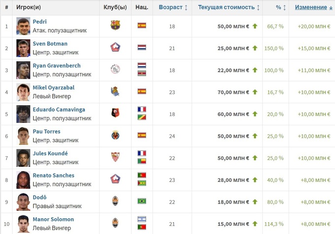 Відразу по 8 мільйонів євро до своєї вартості «додали» фулбек Додо і вінгер Соломон, які зайняли дев'яте і десяте місце в рейтингу відповідно. Трансфер бразильця нині оцінюється аналітиками в 18 мільйонів євро, ізраїльтянина - в 15 мільйонів. При цьому, перший додав 80% до своєї вартості в порівнянні з колишньою оцінкою порталу, а другий - 114,3%.