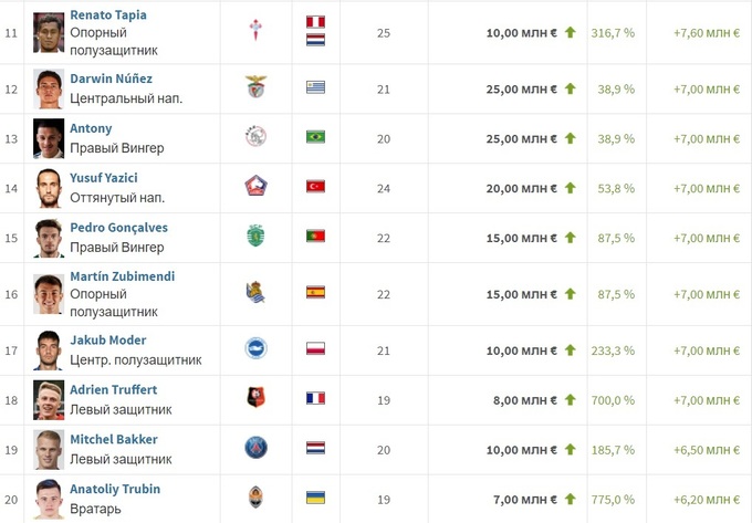 Також в топ-20 увійшов ще один представник УПЛ, і також гравець «Шахтаря» - молодий воротар Анатолій Трубін. Його оціночна вартість зросла на фантастичні 775% - з 800 тисяч євро до 7 мільйонів.
