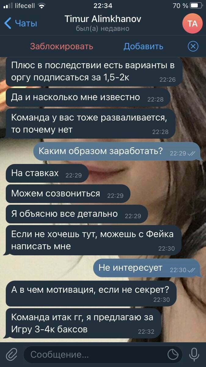 Український кіберспортсмен опублікував скріншот листування з людиною, яка запропонувала йому заробити на ставках. За матч Funn1k запропонували отримати 3-4 тисячі доларів. Кіберспортсмен відмовився від цієї пропозиції.