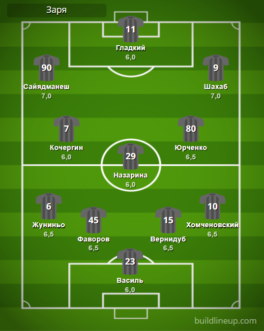 «Зоря»: Василь – Жуніньо, Фаворов, Вернидуб, Хомченовський – Кочергін, Назарина, Юрченко (Казаков, 88) – Сайядманеш (Луньов, 90+4), Гладкий, Шахаб (Руфаті, 90).