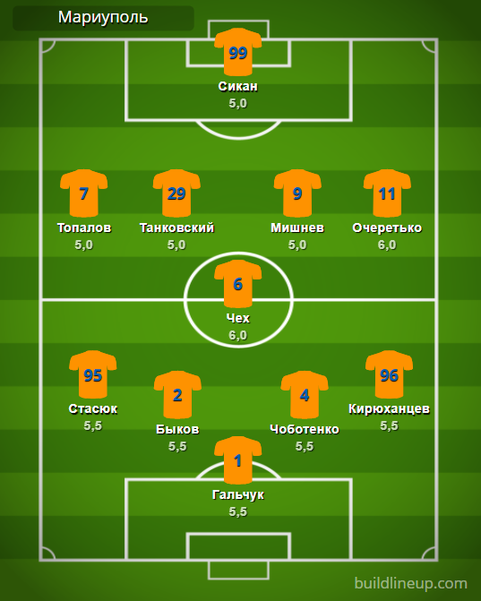 «Маріуполь»: Гальчук – Стасюк (Драмбаєв, 59), Биков, Чоботенко, Кирюханцев – Чех (Петерман, 75) – Топалов (Кулієв, 75), Танковський, Мишньов (Кащук, 59), Очеретько – Сікан (Кулаков, 69).