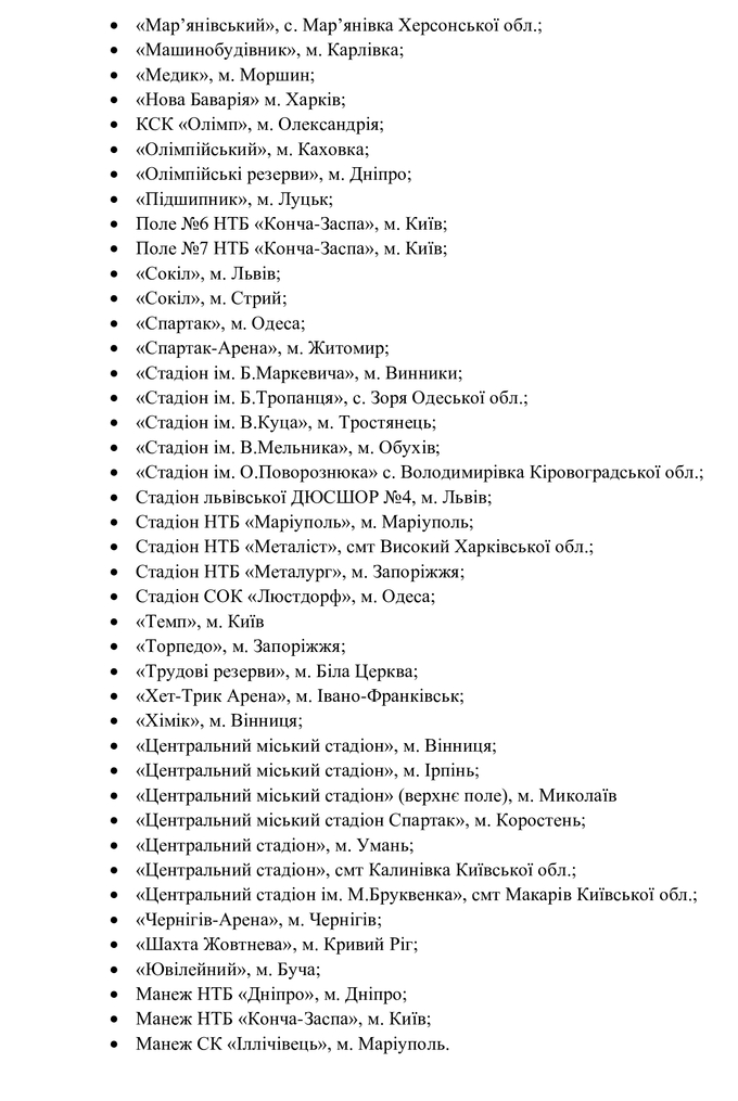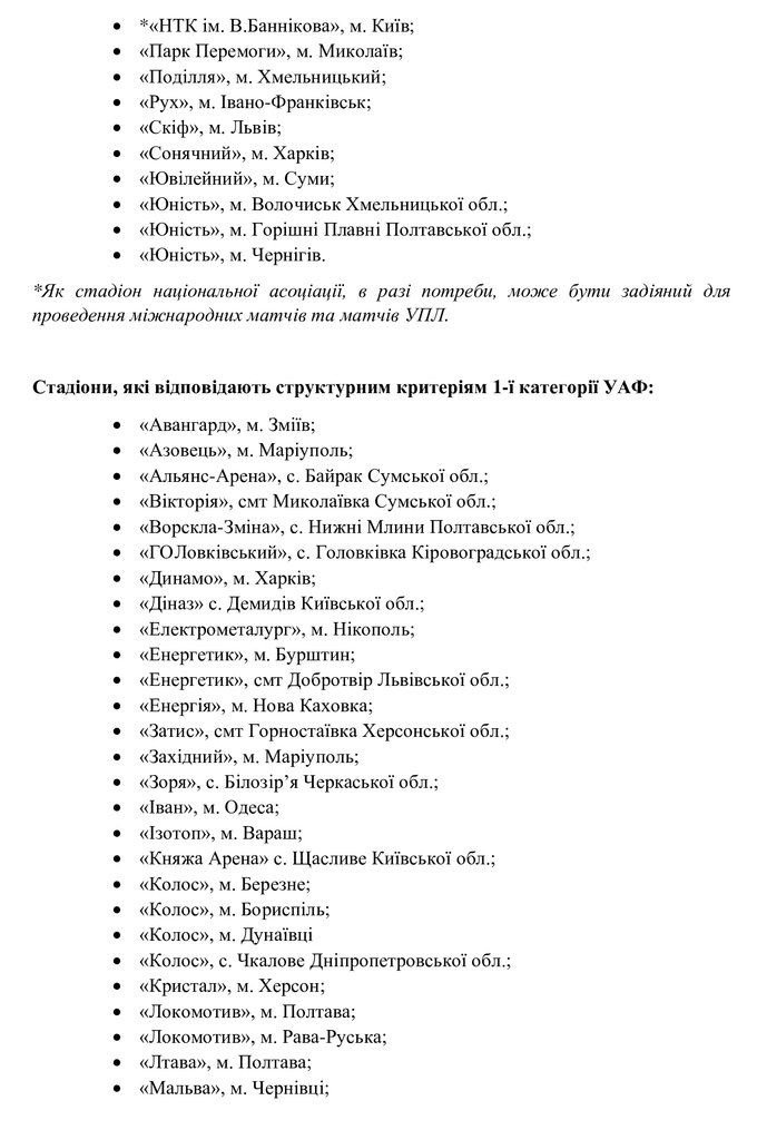 На засіданні Виконавчого комітету УАФ було розглянуто звернення Комітету з питань стадіонів та безпеки проведення змагань УАФ про затвердження списку стадіонів України, які відповідають структурним критеріям категорій УАФ.