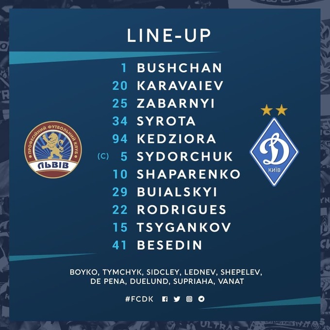 «Динамо»: Бущан, Караваєв, Сирота, Забарний, Кендзьора, Сидорчук, Шапаренко, Циганков, Буяльський, Родрігеш, Бєсєдін.