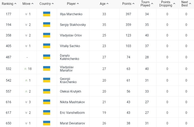Що стосується українців, то перші чотири ракетки синхронно втратили по одному-два місця, найбільш додав Владислав Манафов.