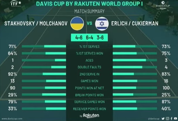 Завершився парний матч в рамках командної зустрічі Першої Світової групи Кубка Девіса між збірними України та Ізраїлю.