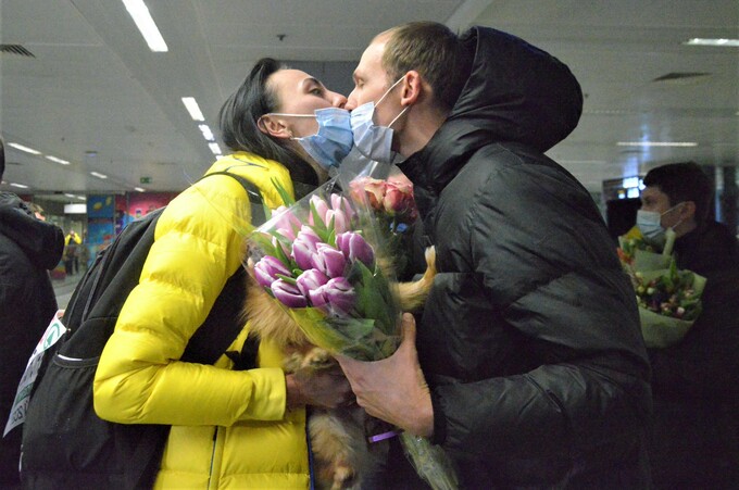 Власне, медалістки в аеропорту вийшли попереду решти колег і колежанок за збірною. Першою привітання отримала Ірина Геращенко, до якої, вирвавшись із рук Ірининого чоловіка Сергія, побігла собачка Лакі. А вже потім кохану великим букетом квітів зустрів її суджений. Поцілувалося подружжя через масочки, з чого потім саме й покепкувало.