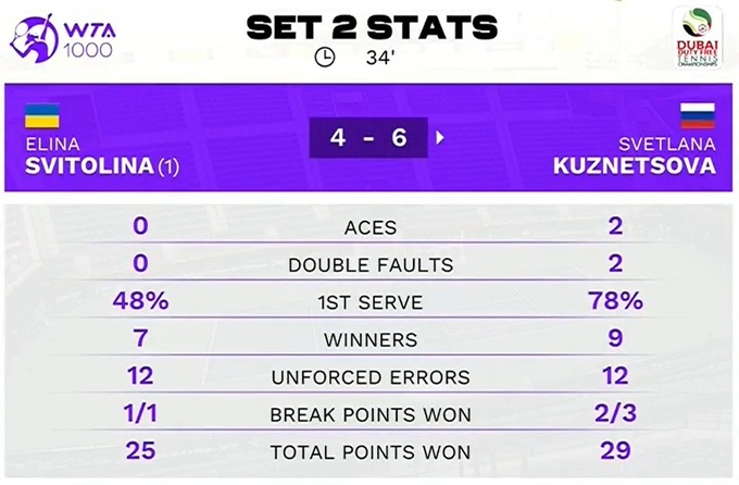 На початку другої партії Еліна оформила швидкий брейк, по такій грі це могло означати близьке завершення матчу. Але Кузнєцова підвищила свій рівень, стала набагато краще подавати і перестала помилятися в простих ситуаціях. На корті дійсно з'явилася справжня боротьба. Росіянка оформила зворотний брейк і раптово перестала віддавати свої подачі. Після слабкого першого сету від росіянки Еліна трохи зменшила оберти, під час виконання деяких завершальних ударів проглядалося зниження концентрації. Помилки українки і свої успіхи додали впевненості Кузнєцової, яка заграла агресивніше і інтенсивніше. У 10-му геймі росіянка не боялася ризикувати і закономірно вирвала перемогу у другій партії.