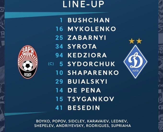 Динамо: Бущан, Кендзьора, Сирота, Забарний, Миколенко, Буяльський, Сидорчук, Шапаренко, Де Пена, Циганков, Бєсєдін