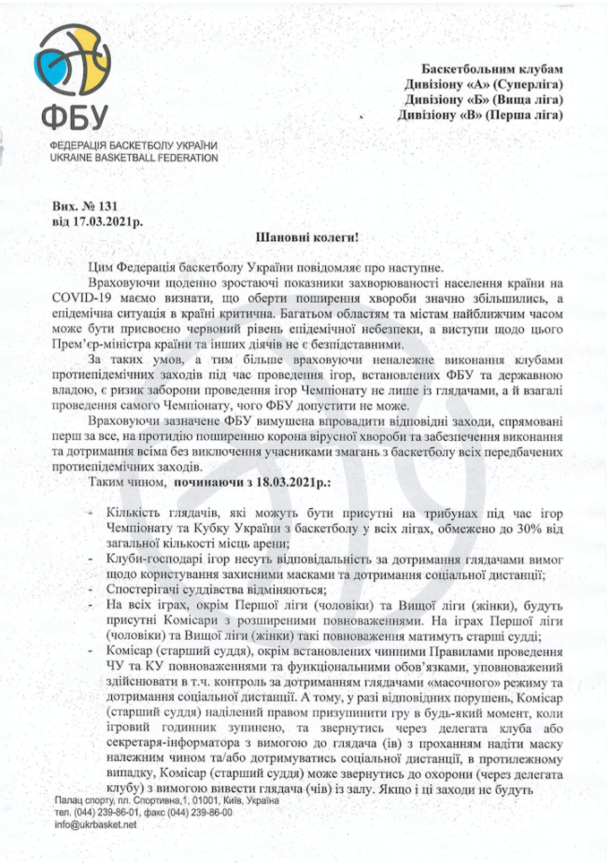 Федерація баскетболу України виступила із заявою щодо проведення матчів чемпіонатів та Кубку України в усіх лігах.