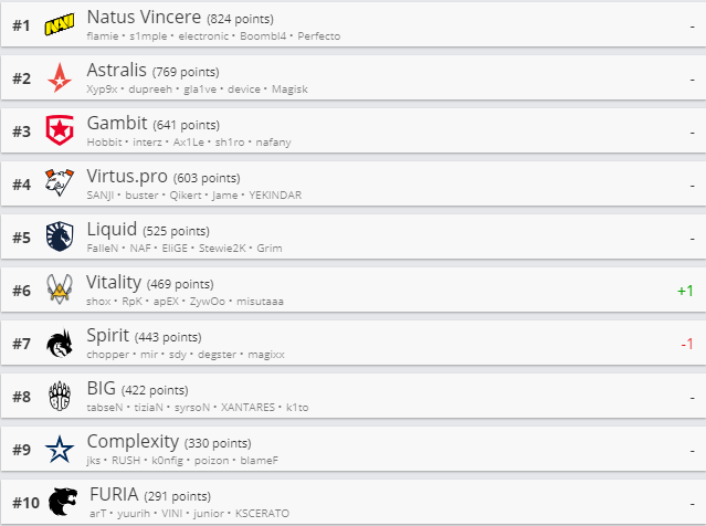 Нагадаємо, що в даний момент проходить ESL Pro League, після цього турніру в рейтингу можуть відбутися зміни.