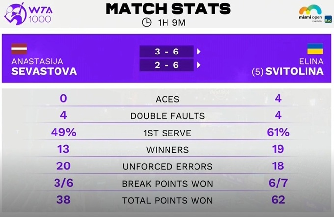 На старті другої партії Еліна виграла чотири гейми поспіль, після чого гра трохи вирівнялася, але здобути перемогу українці труднощів не склало. Сьогодні була чудова реалізація брейкпойнтів від Еліни і чудова реалізація її найкращих якостей в матчі з суперницею, яка поступається в потужності.