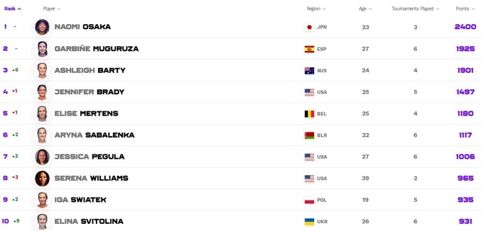 Фіналістка Б’янка Андреєску з Канади зробила найбільший прогрес в першій десятці, піднявшись з дев'ятого на шосте місце. Цікаво, що за новими правилами Андреєску збереже ще на рік очки за перемогу на турнірі в Індіан-Веллсі за 2019 рік, так як дані змагання двічі скасовували.