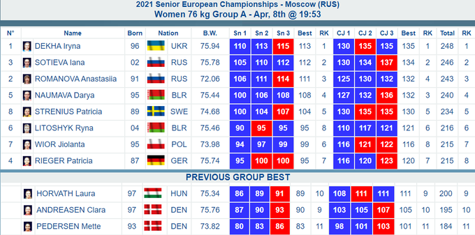 Раніше аналогічне досягнення (три золоті медалі) на ЧЄ-2021 Москві підкорилося українській важкоатлетці Камілі Конотоп у ваговій категорії до 55 кг.