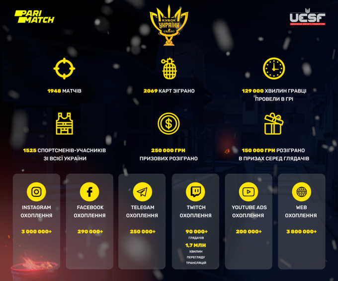Загальний призовий фонд Кубка України від UESF, нагадаємо, склав 250 тисяч гривень. Але і інші цифри турніру, який пройшов за підтримки Parimatch, провідного букмекера в кіберспорті, вражають: