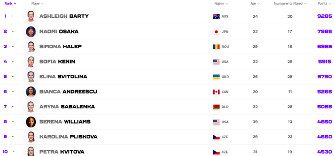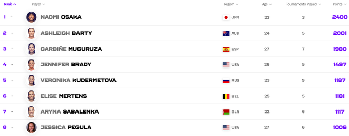У Чемпіонській гонці також без особливих змін. Еліна Світоліна залишається на 11-й позиції.