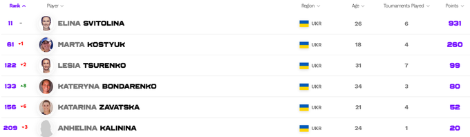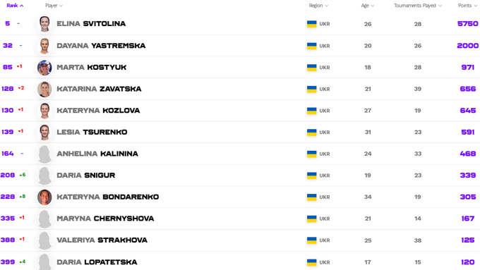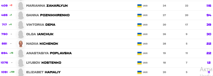 Що стосується українок, то трохи додали Дар’я Снігур та Катерина Бондаренко. У решти зміни незначні.