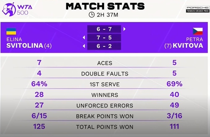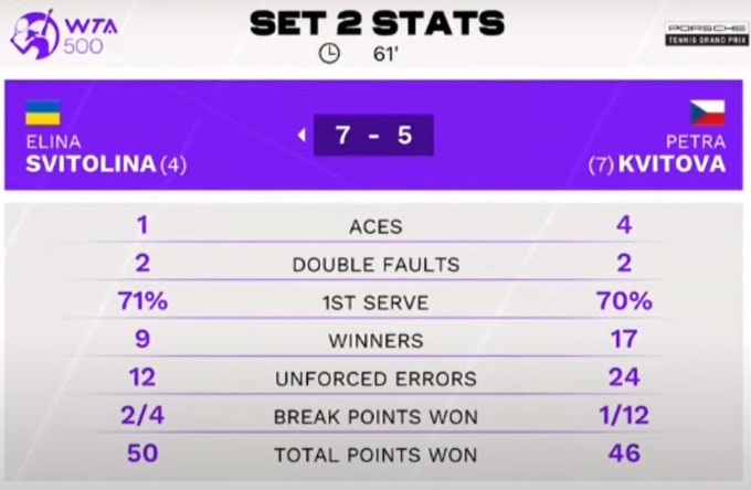 Початок матчу залишився за Світоліною, яка повела 2:0, але Квітова дуже швидко пристрілялася, не відпустивши українку у відрив. Загалом на корті була досить рівна гра, Еліна в останніх матчах проти Петри грає без остраху і знає, що дану суперницю можна перемагати.