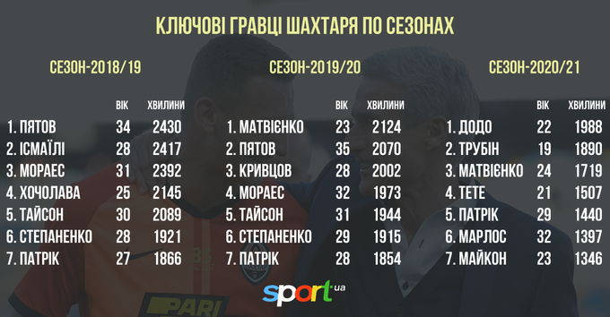 Підтверджує вищевикладену тезу і статистика. Досить оцінити те, хто складав кістяк команди в трьох крайніх сезонах - останньому Фонсеки та двох Каштру. Ці цифри дають чітке розуміння ситуації: Луїш не став в прем'єрному сезоні влаштовувати глобальну перебудову складу. По суті, у нього грали ті ж обличчя, що і у Фонсеки в сезоні-2018/19. Молодих футболістів в когорті ключових був мінімум, а якщо точніше, то один лише Матвієнко. Всі інші - перевірені часом Пятов, Кривцов, Мораес, Тайсон, Степаненко і Патрік. На цих «китах», до яких варто ще додати Ісмаїлі та Марлоса, по суті, і будувався феноменальний успіх минулорічного «Шахтаря». Якщо бути ще більш чесним, то це була команда, яку вибудував й довів до розуму Фонсека, а Каштру вистачило досвіду і розуміння, щоб не знищити все те хороше, що насправді залишив йому попередник.