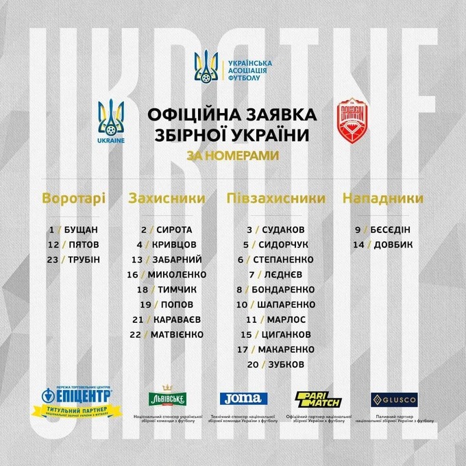 Заявка збірної України на матч з Бахрейном (за номерами)