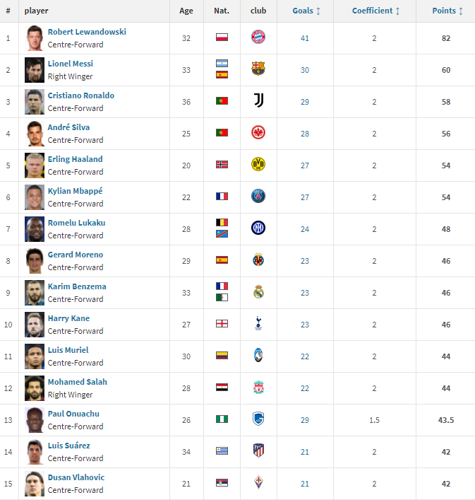 Левандовськи забив 41 м'яч і випередив форварда каталонської «Барселони» Ліонеля Мессі, який розташувався на другій сходинці, на 11 голів.