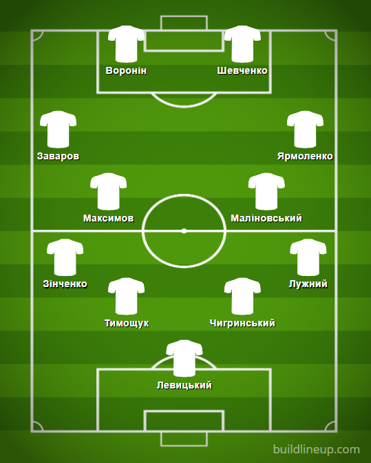 Олександр Зінченко («Манчестер Сіті») – Анатолій Тимощук («Баварія») – Дмитро Чигринський («Барселона») – Олег Лужний («Арсенал», «Вулвергемптон»).