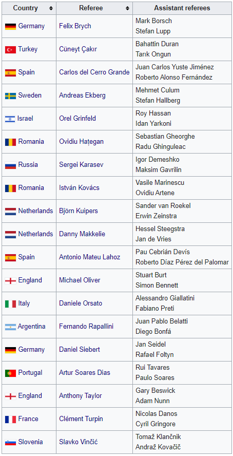 Матчі EURO-2020 обслуговуватимуть 19 арбітрів з 14 країн. До їхнього числа входить аргентинець Фернандо Рапалліні, який став першим рефері з Південної Америки, обраним для участі в чемпіонаті Європи. Шість арбітрів працювали на попередніх фінальних турнірах. Німець Фелікс Брих, росіянин Сергій Карасьов, француз Клеман Тюрпен і румун Овідіу Хацеган - на ЧЄ 2016, а нідерландець Бьорн Кейперс і турок Джюнейт Чакир - ще і на ЧЄ-2012.