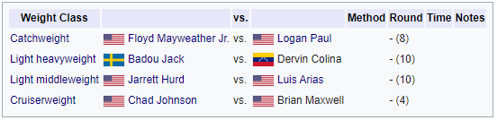 Головним боєм шоу буде 8-раундовий виставковий поєдинок між екс-чемпіоном світу в п'яти вагових категоріях Флойдом Мейвезером і популярним відеоблогером Логаном Полом.