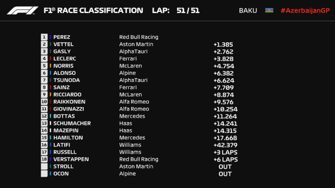 А гонку виграв Серхіо Перес. Перша перемога мексиканця в Ред Буллі. Подіум замкнули Феттель і Гаслі. Ось це гонка.