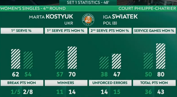 Після трьох зіграних геймів українка вела 2:1 з брейком, але далі трохи не пощастило. Обидва гейми до наступного переходу були максимально близькими, але обидва виграла полька. Костюк вдалося зрівнятися на трьох, після чого вона не змогла реалізувати подвійний брейкпойнт. В одному з моментів Марта пробивала вже у відкриту частину корту, але трохи помилилася по довжині. Схоже на те, що це трохи вдарило по моралі українки і додало впевненості польці. Тому що до кінця першої партії особливої боротьби вже не вийшло. Іга кілька разів помилилася на сетболах, але все ж забрала перший сет.