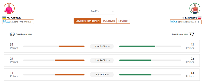 Якщо чесно, після цього в інтригу вже не вірилось, особливо після того як Костюк не змогла реалізувати ще один брейпойнт. Але Марта продовжувала дивувати, відіграла матчбол, захистивши подачу, і навіть вела в два м'ячі на прийомі. І все ж більше сил залишилося у Свьонтек, вона і перемогла. Фінальне очко знову було зароблене шикарною свічкою.
