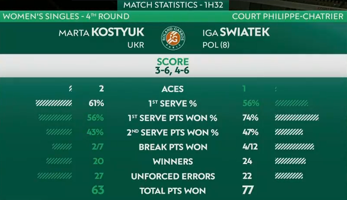 Загалом Марта показала дуже високий рівень тенісу, якого, швидше за все, могло вистачити для того, щоб обіграти будь-яку іншу з суперниць, які залишилися на турнірі. Але сіткою попалася Свьонтек, тому поки маємо такий результат. У будь-якому випадку виступ на кортах Парижа вселяє впевненість в тому, що Марта найближчим часом буде продовжувати прогресувати. У спортивному плані у неї все для цього є, зараз ми бачимо, що і ментально вона вже готова до великих перемог. Свьонтек хотілося б побажати захистити титул, вона цього цілком заслуговує.