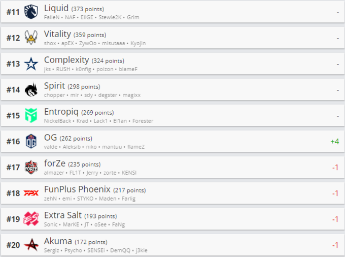 Оновлений склад FURIA Esports втратив два пункти і опустився на дев'яте місце, поступившись BIG і Virtus.pro. ENCE і Evil Geniuses повернулися в топ-30, додавши чотири і вісім позицій відповідно. FaZe Clan покинула тридцятку найкращих після переходу Марсело coldzera Давіда в запас.